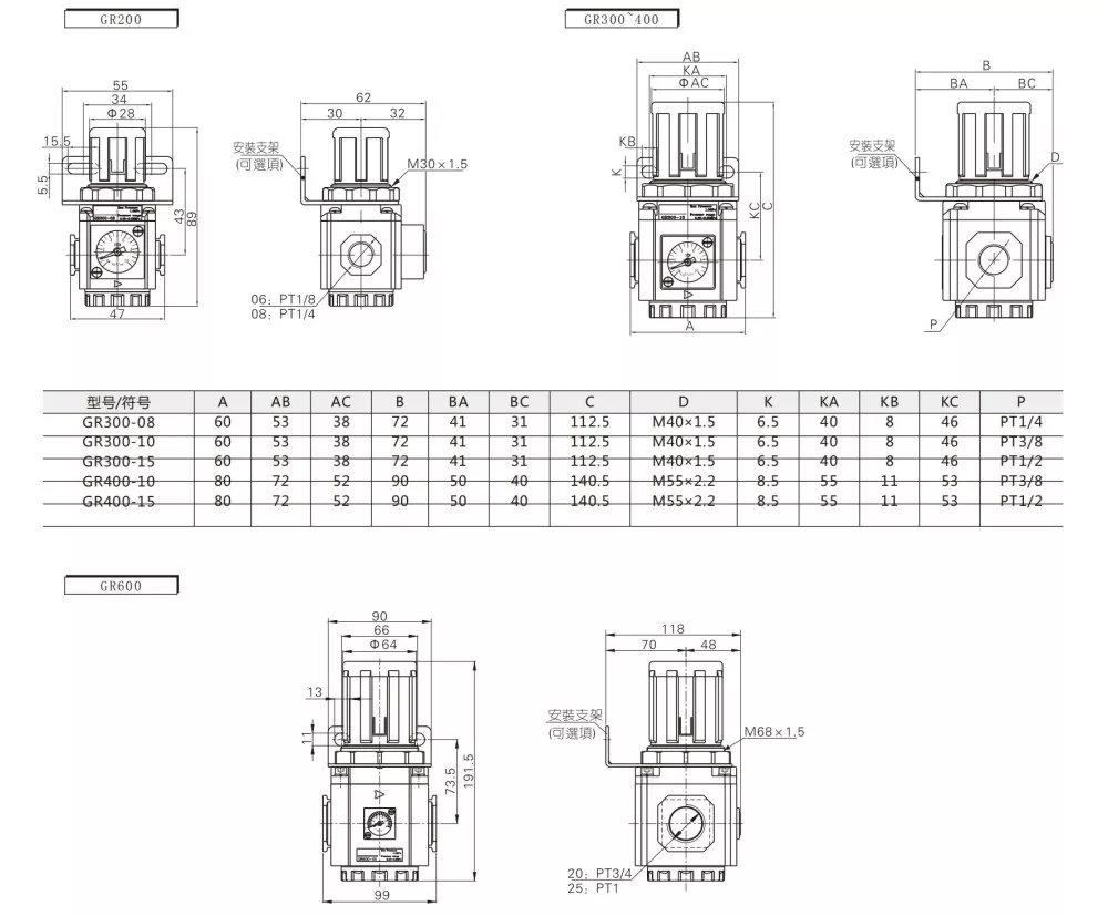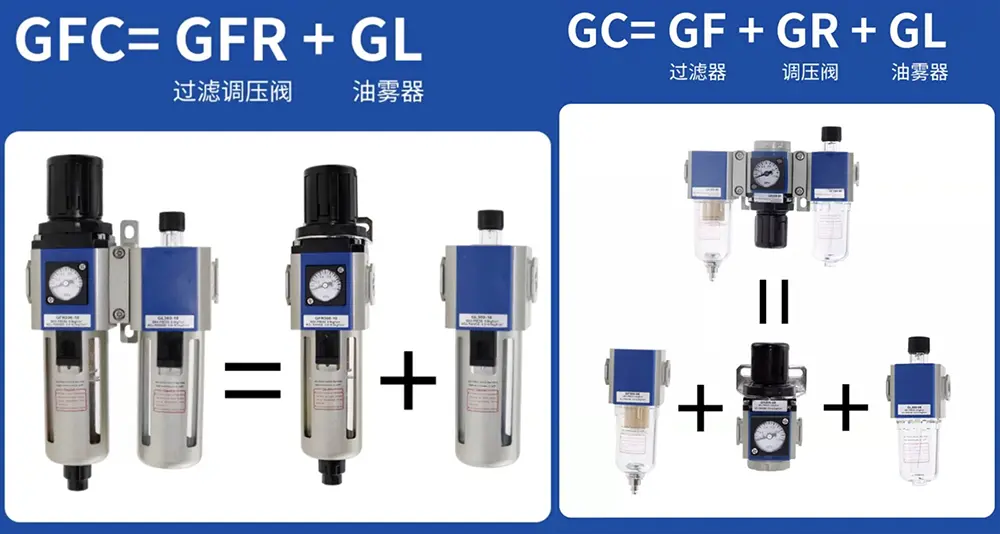 جی سی = جی ایف + جی آر + جی ایل (فلٹر + نیومیٹک ریگولیٹر + چکنا کرنے والا)
