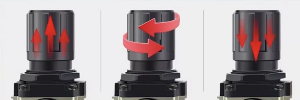 ایڈجسٹمنٹ کیپ پر پریشر اسکیل ہے۔ جب ہوا فراہم کی جاتی ہے تو ، نوب کو کھینچیں اور دباؤ کو بڑھانے کے لئے اسے گھڑی کی سمت "+" نشان کی طرف موڑ دیں۔ ایڈجسٹمنٹ کے بعد ، اسے لاک کرنے کے لئے نیچے نیچے دبائیں۔