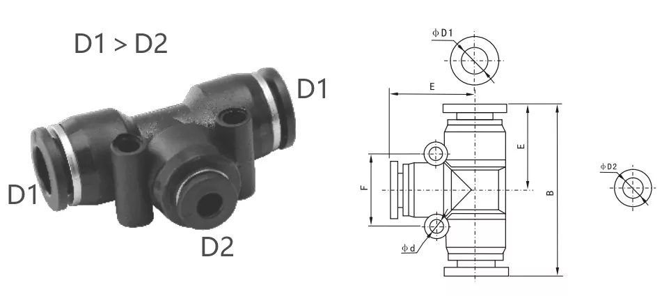 پی ای جی فٹنگ (ریڈوسر ٹی یونین): دونوں طرف کے ٹیوبیں سینٹر ٹیوب سے بڑے ہیں ، جو مختلف ٹیوب سائز کو مربوط کرنے کے لئے ڈیزائن کیا گیا ہے۔