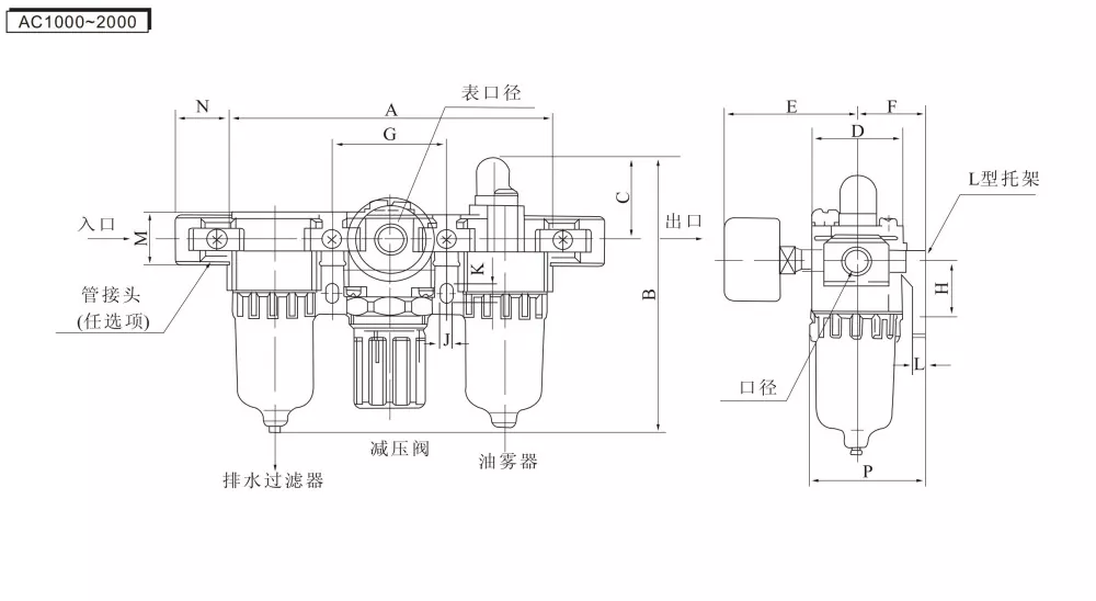 اے ایف (ایئر فلٹر) + اے آر (دباؤ ریگولیٹنگ والو) + ال (آئل مسٹ چکنا کرنے والا) = اے سی ٹرپل یونٹ