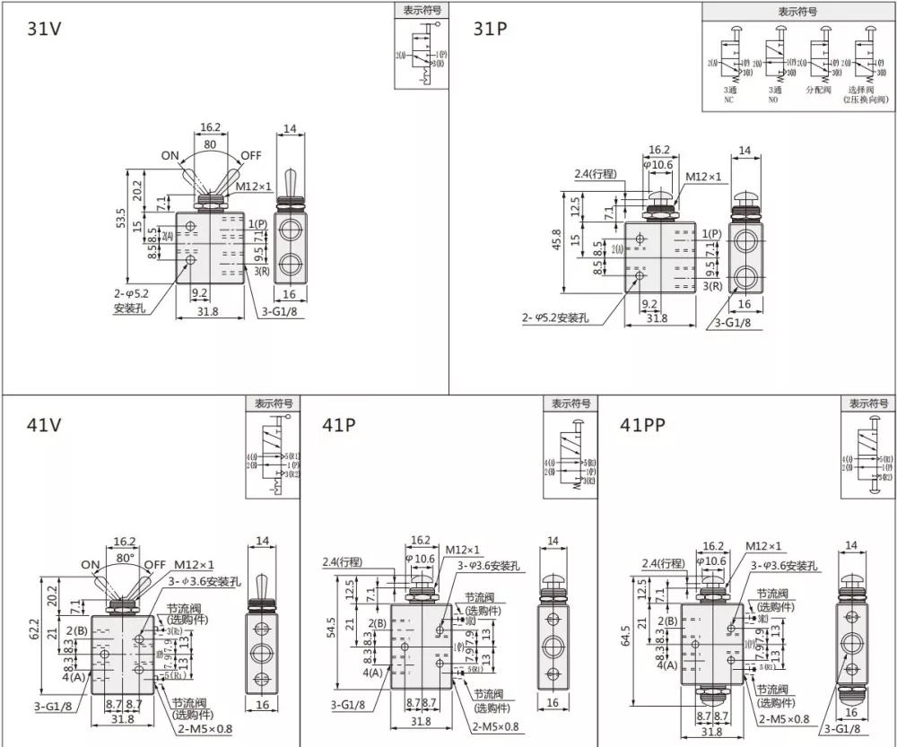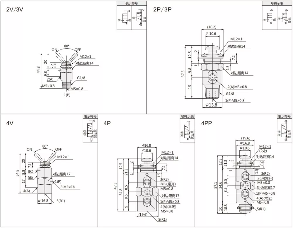 ٹی اے سی سیریز ٹوگل والو میں 2 پوزیشن 2 وے ، 2 پوزیشن 3 وے اور 2 پوزیشن 5 وے کا انتخاب کیا جاسکتا ہے۔ لیور کی قسم اور دو اقسام کے تھریڈ: ایم 5 ، جی 1/8۔