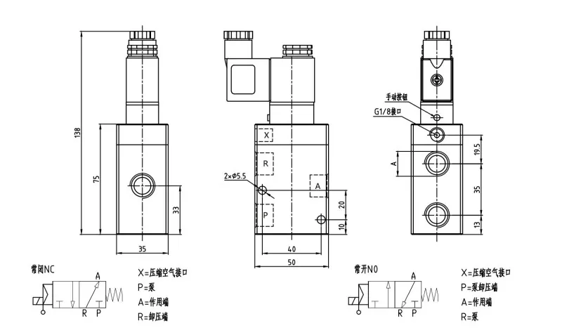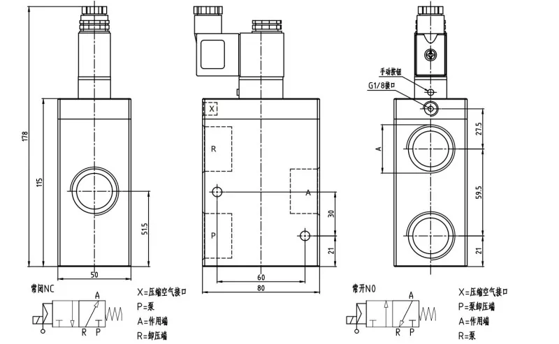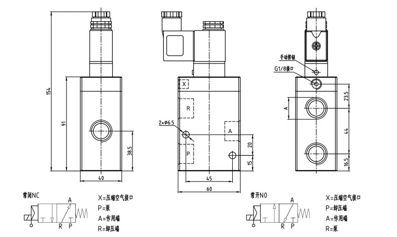 تھریڈڈ پورٹ (P ، A ، R) سائز G3/8 ، G1/2 ، اور G1 میں دستیاب ہیں ، G1/8 میں کمپریسڈ ایئر پورٹ (X) کے ساتھ۔